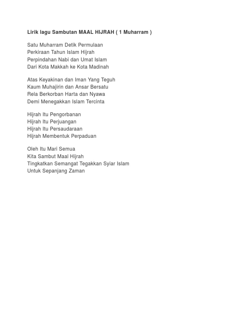 Satu Muharram Detik Permulaan Perkiraan Tahun Islam Hijrah Perpindahan Nabi dan Umat Islam. Dari kota Mekah ke kota Madinah. Lirik lagu maal hijrah rasmi untuk sambutan maal hijrah di.